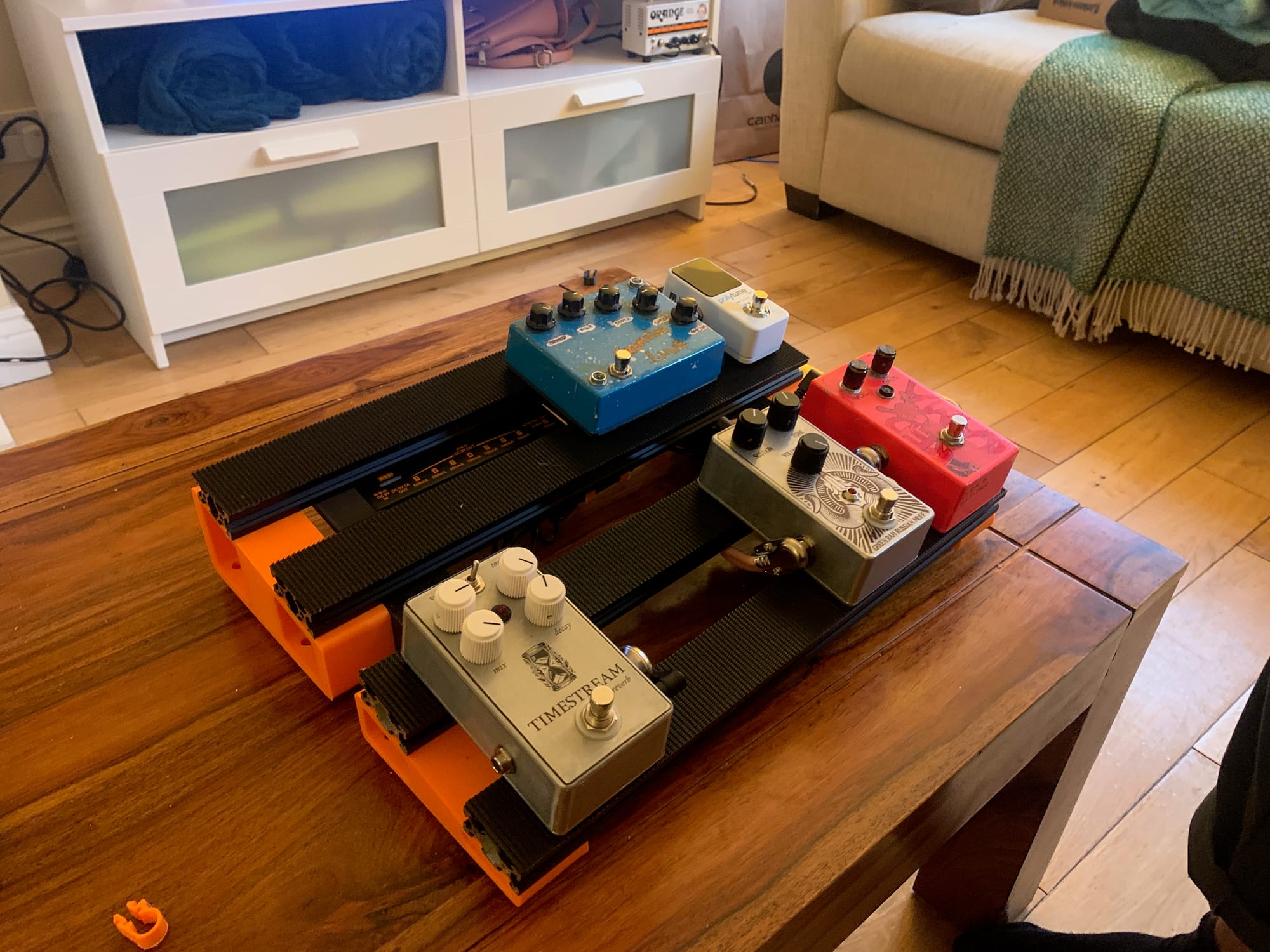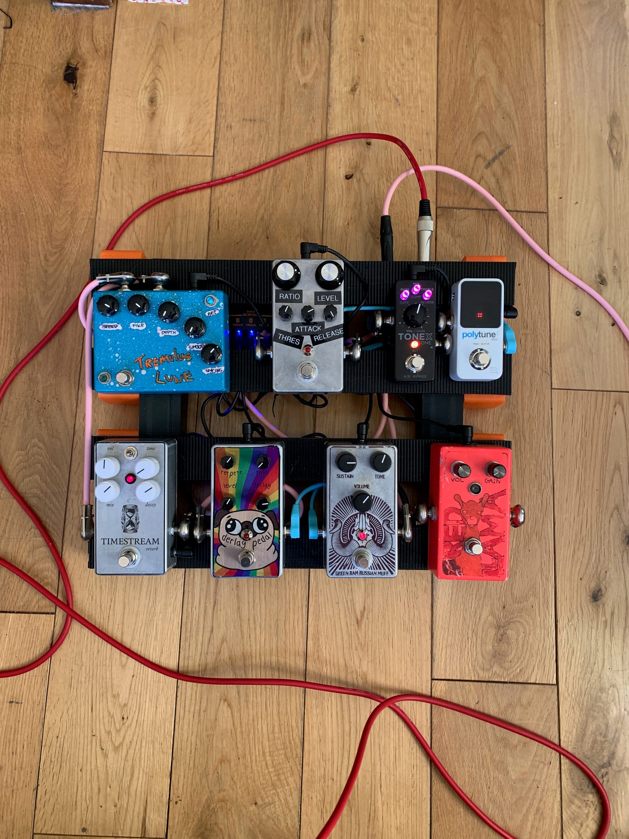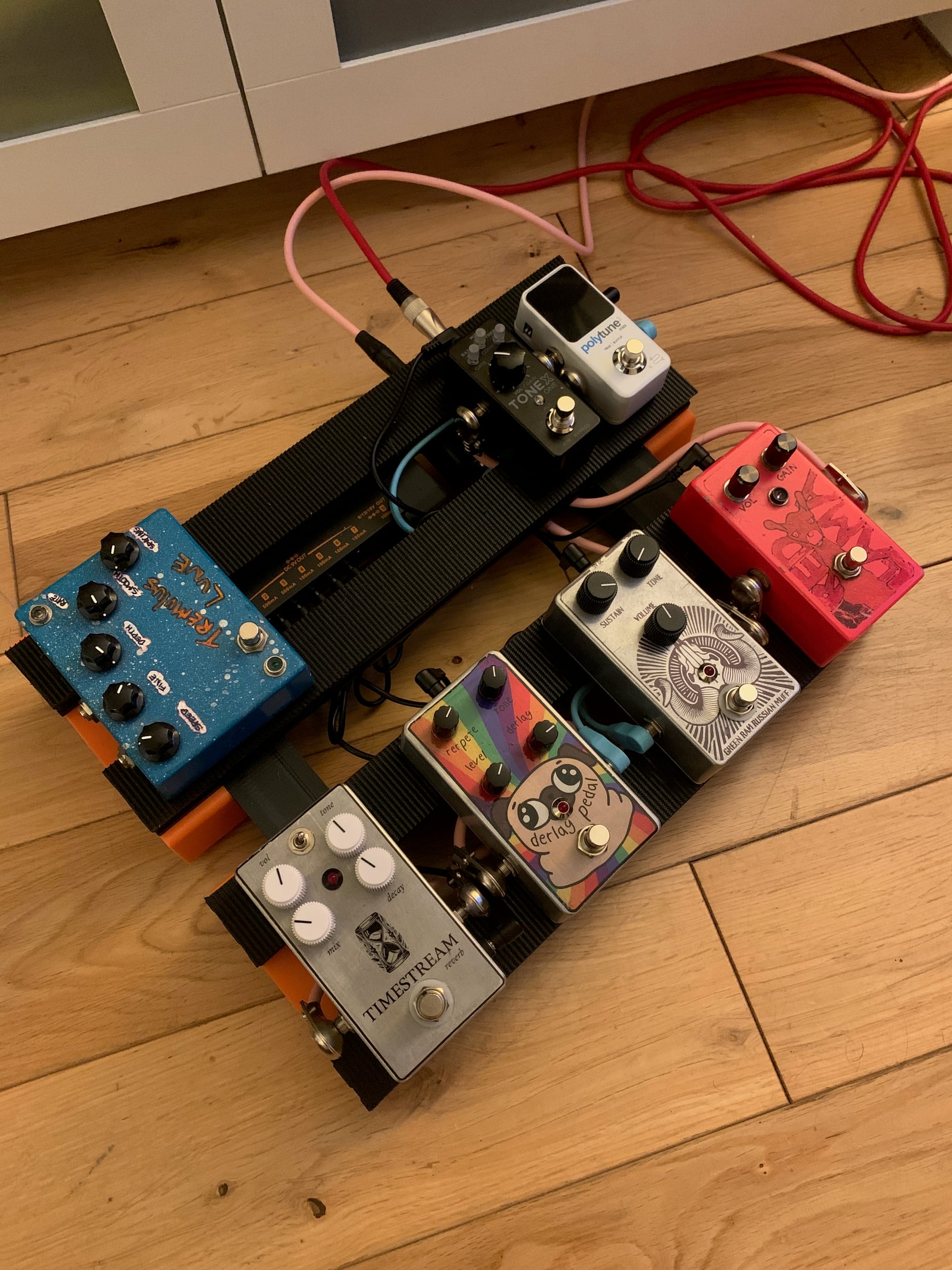 I’ve been slowly building out a fully handmade guitar rig, and this pedalboard is one of the projects I’m most proud of. (Almost) every pedal on it is something I built from scratch—old-school analog circuits, hand-assembled PCBs, custom graphics, and a few hand-painted enclosures for good measure. To tie it all together, I designed and built the board itself using aluminium extrusion and 3D-printed parts, with a tidy battery-powered supply tucked underneath so the whole setup stays portable and clutter-free.